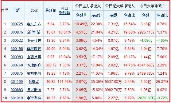 今日沪深两市主力资金净流入排名前5的个股分别为:京东方A、新 希 望、中天科技、复星医药、山西焦煤;主力资金净流出排名前5的个股分别为:隆基股份、五 粮 液、比亚迪、宁德时代、华友钴业。