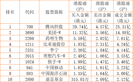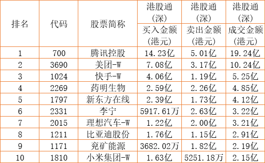 亚汇网实时数据统计:截至10月20日收盘,腾讯控股、美团-W、药明生物位居港股通(沪)成交前三,腾讯控股、美团-W、快手-W位居股通(深)成交前三。