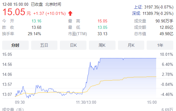 重要资讯:沪深交易所2022年12月08日公布的交易公开信息显示,丰原药业因成为当日价格振幅达到15%的证券、当日涨幅偏离值达7%的证券上榜。丰原药业当日收报15.05元,涨跌幅10.01%,偏离值10.32%,振幅15.33%,换手率29.14%,成交额12.85亿元。