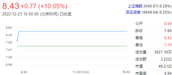 重要资讯:沪深交易所2022年12月23日公布的交易公开信息显示,广弘控股因成为连续三个交易日内收盘价格涨幅偏离值累计20%上榜。广弘控股当日收报8.43元,涨跌幅10.05%,换手率6.89%,成交额3.22亿元。异常期间12月22日至12月23日,期间涨幅21.12%,累计偏离值22.12%,区间成交额5.93亿元。