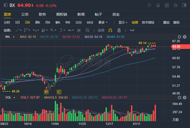 黑石昨日股价微跌,盘中股价创新高至66.14美元。