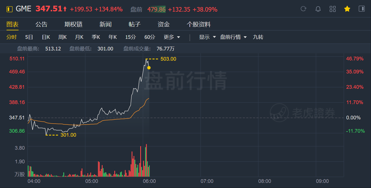 1月28日美股盘前,游戏驿站上演反转,涨幅一路扩大至44%,股价站上500美元!此前该股一度跌超13%。