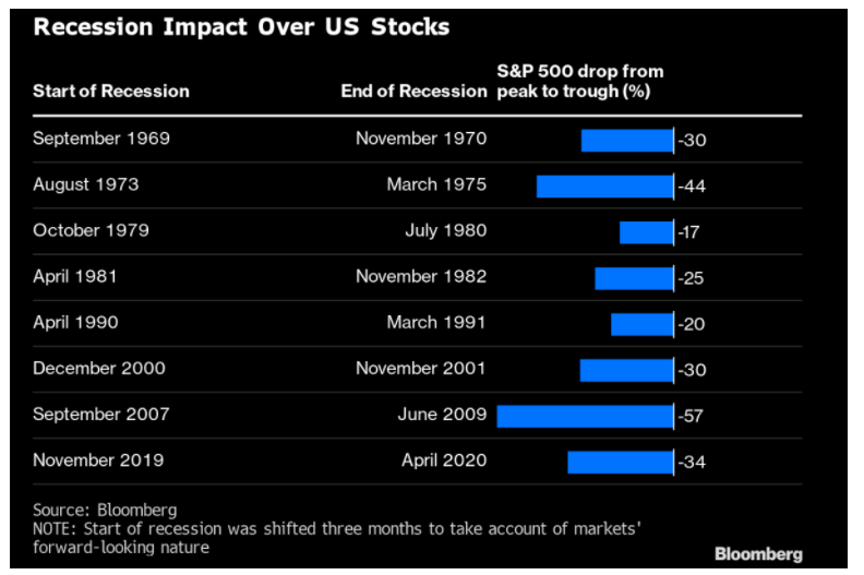 如果以史为鉴,标普500指数若要消化美国经济衰退的影响,应会进一步大幅下跌。根据一项研究,自1969年以来的八次经济衰退中,标普500指数从峰值到低谷平均下跌32%。如果该指数从1月高位下跌类似幅度,将跌至3262点。标普500指数周四收于4200点左右。