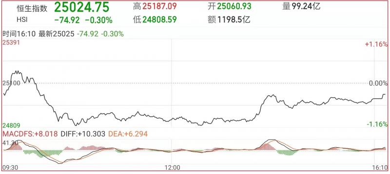 1.恒指昨早市先低开39点至25060点,其后曾一度倒升88点至25187点。但由于买盘乏力,加上零碎沽压又再渗着涌现,故整个大市卒再度受压。而恒指更一到急回291点至24808点,午后恒指跌幅收窄,截至收盘,恒指跌0.3%,报25024.75点,国企指数跌0.08%,红筹指数跌0.5%;