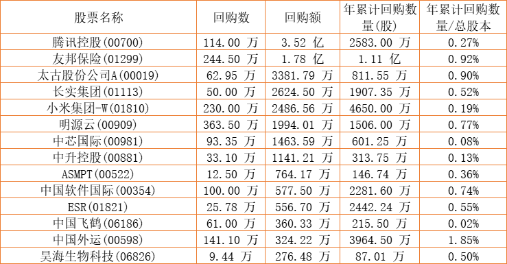 第一太平(00142)、IMAX CHINA(01970)、维信金科(02003)、澳能建设(01183)、ASMPT(00522)、金川国际(02362)、建业新生活(09983)、DYNAM JAPAN(06889)、北控水务集团(00371)、位元堂(00897)、腾讯控股(00700)、天伦燃气(01600)、昊海生物科技(06826)、清科创业(01945)、彩星集团(00635)、中国外运(00598)、新鸿基公司(00086)、中芯国际(00981)、长实集团(01113)、亚洲联合基建控股(00711)、德琪医药-B(06996)、绿城服务(02869)、友邦保险(01299)、方达控股(01521)、明源云(00909)、乐声电子(00213)、英皇娱乐酒店(00296)、太古股份公司A(00019)、硬蛋创新(00400)、民银资本(01141)、太古股份公司B(00087)、赛晶科技(00580)、小米集团-W(01810)、汇量科技(01860)、移卡(09923)、天福(06868)、中国飞鹤(06186)、港龙中国地产(06968)、康圣环球(09960)、ESR(01821)、中升控股(00881)、祖龙娱乐(09990)、知乎-W(02390)于2022年9月7日进行了回购。其中,回购金额最大的为腾讯控股(00700),回购数量114.00 万,回购金额3.52 亿元。