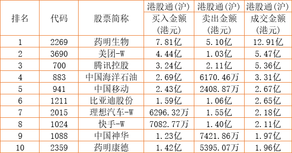 港股通(沪)买卖前十股(单位:港元):