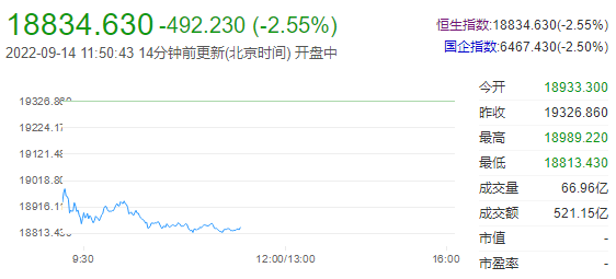 今早亚太股市亦出现显著下跌,今日开盘,港股恒指低开2.04%,随后跌幅扩大。截至午间收盘,恒生指数跌2.55%,报18834.63点,国企指数跌2.5%,红筹指数跌1.35%。恒生科技指数跌2.96%,创科实业跌10.56%,百度跌5.44%,阿里跌4.39%。