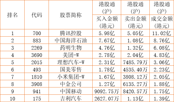 港股通(沪)买卖前十股(单位:港元):