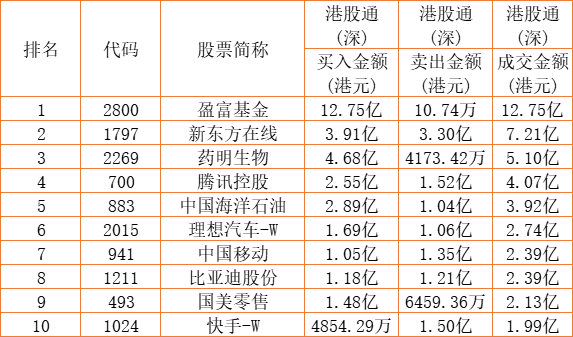 港股通(深)买卖前十股(单位:港元):
