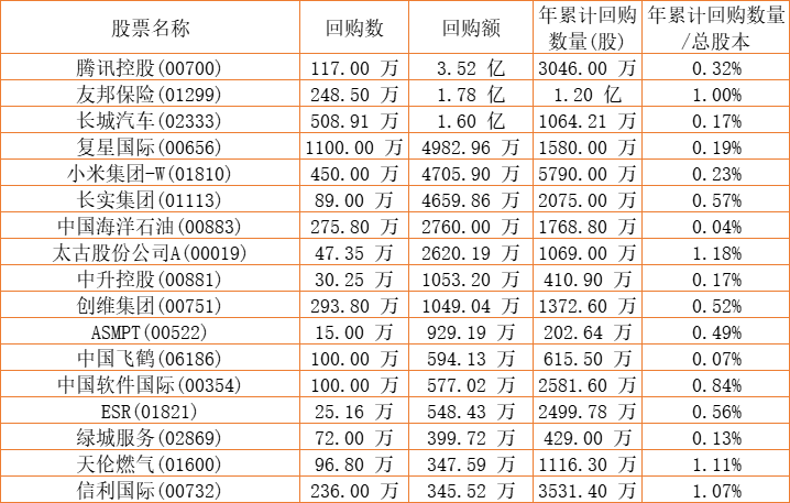 天福(06868)、建业新生活(09983)、第一太平(00142)、德祥地产(00199)、腾讯控股(00700)、景福集团(00280)、金川国际(02362)、天伦燃气(01600)、民银资本(01141)、方达控股(01521)、长实集团(01113)、北控水务集团(00371)、中国外运(00598)、中国软件国际(00354)、中国海洋石油(00883)、IMAX CHINA(01970)、彩星集团(00635)、伟仕佳杰(00856)、绿城服务(02869)、德琪医药-B(06996)、祖龙娱乐(09990)、赛晶科技(00580)、长城汽车(02333)、昊海生物科技(06826)、明源云(00909)、DYNAM JAPAN(06889)、英皇娱乐酒店(00296)、友邦保险(01299)、信利国际(00732)、太古股份公司A(00019)、太古股份公司B(00087)、清科创业(01945)、德信服务集团(02215)、小米集团-W(01810)、移卡(09923)、创胜集团-B(06628)、乐声电子(00213)、中国飞鹤(06186)、汇量科技(01860)、港龙中国地产(06968)、硬蛋创新(00400)、康圣环球(09960)、复星国际(00656)、中升控股(00881)、永达汽车(03669)、ESR(01821)、圣诺医药-B(02257)、知乎-W(02390)于2022年9月14日进行了回购。其中,回购金额最大的为腾讯控股(00700),回购数量117.00 万,回购金额3.52 亿元。