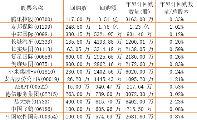 新鸿基公司(00086)、创维集团(00751)、腾讯控股(00700)、中国软件国际(00354)、天福(06868)、亚洲金融(00662)、昊海生物科技(06826)、彩星集团(00635)、DYNAM JAPAN(06889)、天伦燃气(01600)、德祥地产(00199)、中国外运(00598)、金川国际(02362)、长城汽车(02333)、方达控股(01521)、清科创业(01945)、信利国际(00732)、康健国际医疗(03886)、祖龙娱乐(09990)、联易融科技-W(09959)、太古股份公司A(00019)、北控水务集团(00371)、太古股份公司B(00087)、英皇娱乐酒店(00296)、复星国际(00656)、赛晶科技(00580)、山高控股(00412)、德琪医药-B(06996)、硬蛋创新(00400)、易大宗(01733)、友邦保险(01299)、民银资本(01141)、港龙中国地产(06968)、长实集团(01113)、中芯国际(00981)、明源云(00909)、汇量科技(01860)、德信服务集团(02215)、移卡(09923)、乐声电子(00213)、中国飞鹤(06186)、圣诺医药-B(02257)、第一太平(00142)、力世纪(00860)、小米集团-W(01810)、亿都(国际控股)(00259)、赛生药业(06600)、创梦天地(01119)、康圣环球(09960)、ESR(01821)、建业新生活(09983)、永达汽车(03669)、澳能建设(01183)、知乎-W(02390)于2022年9月15日进行了回购。其中,回购金额最大的为腾讯控股(00700),回购数量117.00 万,回购金额3.51 亿元。