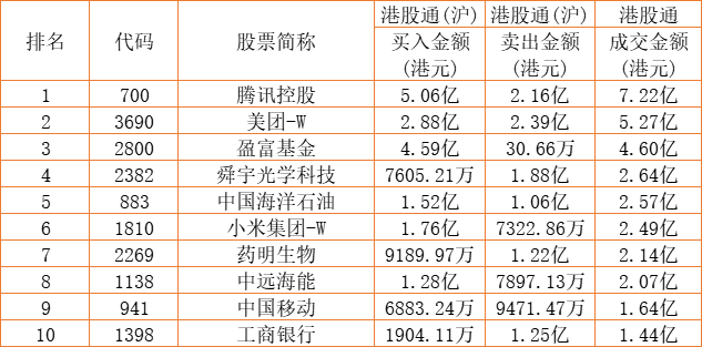 港股通(沪)买卖前十股(单位:港元):
