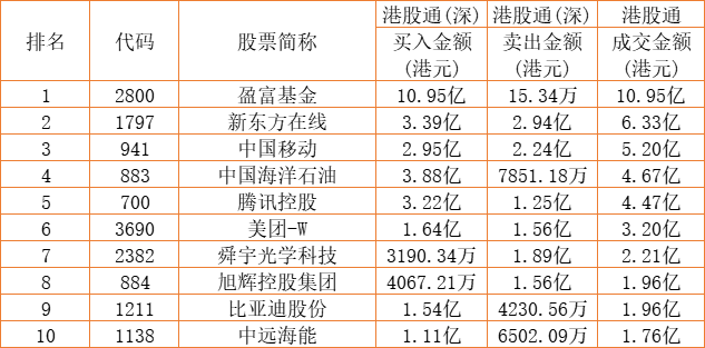 亚汇网实时数据统计:截至9月21日收盘,腾讯控股、美团-W、盈富基金位居港股通(沪)成交前三,盈富基金、新东方在线、中国移动位居股通(深)成交前三。