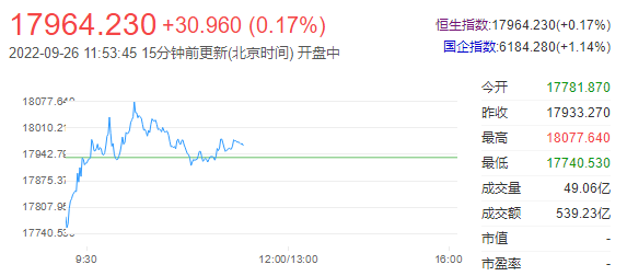 9月26日午间,恒生指数涨0.17%,报17964.23点;国企指数涨1.14%,红筹指数跌0.47%。恒生科技指数涨2.39%,小鹏汽车涨10.58%,理想汽车涨5.78%,腾讯涨4.29%。