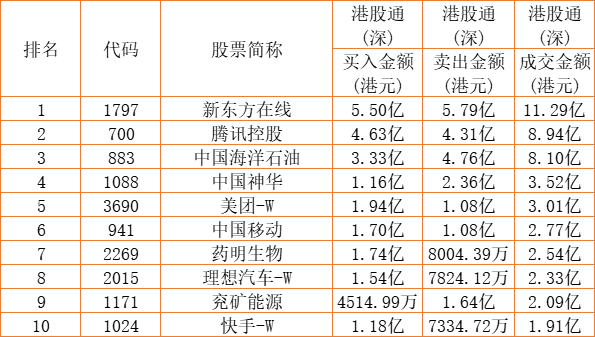 亚汇网实时数据统计:截至9月26日收盘,腾讯控股、中国海洋石油、美团-W位居港股通(沪)成交前三,新东方在线、腾讯控股、中国海洋石油位居股通(深)成交前三。