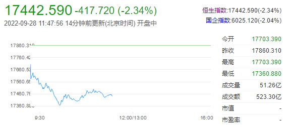 恒指早盘收跌2.33%,报17442.59点;恒生科技指数收跌2.63%,报3570.94点;内房股及物管股早盘领跌,旭辉控股集团重挫近26%,旭辉永升服务大跌18%;新能源汽车板块走低,小鹏汽车跌超7%,理想汽车、蔚来跌超7%。