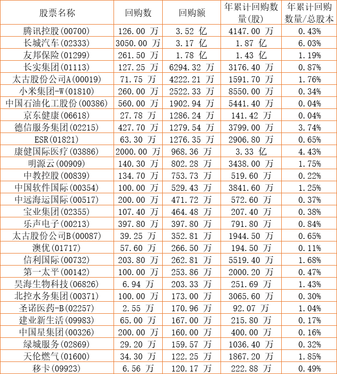 德祥地产(00199)、兴铭控股(08425)、天福(06868)、维信金科(02003)、彩星集团(00635)、绿城服务(02869)、中国软件国际(00354)、第一太平(00142)、腾讯控股(00700)、新鸿基公司(00086)、中国石油化工股份(00386)、天伦燃气(01600)、祖龙娱乐(09990)、澳能建设(01183)、酷派集团(02369)、希慎兴业(00014)、昊海生物科技(06826)、康健国际医疗(03886)、民银资本(01141)、亿都(国际控股)(00259)、中教控股(00839)、创梦天地(01119)、德琪医药-B(06996)、创胜集团-B(06628)、明源云(00909)、长城汽车(02333)、易大宗(01733)、联易融科技-W(09959)、清科创业(01945)、德信服务集团(02215)、友邦保险(01299)、建业新生活(09983)、赛晶科技(00580)、信利国际(00732)、北控水务集团(00371)、澳优(01717)、方达控股(01521)、小米集团-W(01810)、中远海运国际(00517)、长实集团(01113)、港龙中国地产(06968)、汇量科技(01860)、亚洲联网科技(00679)、金利来集团(00533)、京东健康(06618)、太古股份公司A(00019)、太古股份公司B(00087)、乐声电子(00213)、赛生药业(06600)、移卡(09923)、ESR(01821)、康圣环球(09960)、圣诺医药-B(02257)、和谐汽车(03836)、知乎-W(02390)于2022年9月27日进行了回购。其中,回购金额最大的为腾讯控股(00700),回购数量126.00 万,回购金额3.52 亿元。