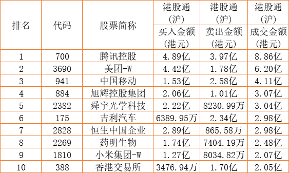 港股通(沪)买卖前十股(单位:港元):