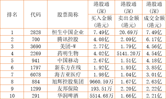 港股通(深)买卖前十股(单位:港元):