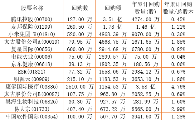第一太平(00142)、永安国际(00289)、摩比发展(00947)、尝高美集团(08371)、彩星集团(00635)、维信金科(02003)、澳能建设(01183)、亚洲金融(00662)、希慎兴业(00014)、德祥地产(00199)、昊海生物科技(06826)、天福(06868)、DYNAM JAPAN(06889)、亿都(国际控股)(00259)、天伦燃气(01600)、民银资本(01141)、瑞安建业(00983)、金利来集团(00533)、康健国际医疗(03886)、中手游(00302)、信利国际(00732)、石四药集团(02005)、清科创业(01945)、腾讯控股(00700)、祖龙娱乐(09990)、绿城服务(02869)、赛晶科技(00580)、新鸿基公司(00086)、兴胜创建(00896)、澳优(01717)、明源云(00909)、伟仕佳杰(00856)、中教控股(00839)、汇量科技(01860)、中远海运国际(00517)、阅文集团(00772)、易大宗(01733)、复星国际(00656)、彩客新能源(01986)、友邦保险(01299)、方达控股(01521)、京东健康(06618)、康哲药业(00867)、港龙中国地产(06968)、乐声电子(00213)、北控水务集团(00371)、APOLLO出行(00860)、太古股份公司A(00019)、太古股份公司B(00087)、赛生药业(06600)、和谐汽车(03836)、康圣环球(09960)、圣诺医药-B(02257)、移卡(09923)、兴铭控股(08425)、东软教育(09616)、亚洲联网科技(00679)、ESR(01821)、小米集团-W(01810)、电能实业(00006)、中国科培(01890)、中国软件国际(00354)、知乎-W(02390)于2022年9月28日进行了回购。其中,回购金额最大的为腾讯控股(00700),回购数量127.00 万,回购金额3.51 亿元。