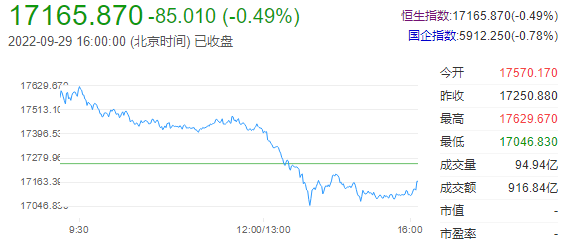 9日29日下午,港股收盘,两大指数大幅高开后走低,香港恒生指数跌0.49%,恒生科技指数跌1.24%。盘面上,智能家居、建筑节能、在线旅游、光热发电、钙钛矿电池、军工、能源设备、海运、医疗保健、航空货运、汽车等板块跌幅居前。啤酒概念等板块逆势上涨。港股后市展望:平安证券认为,低估的优质资产多分布在内地和港股市场。就港股市场而言,无论是恒生科技代表的资讯科技业,还是可选消费、制造业龙头,估值都已经非常便宜,长期配置的机会或许已经来临。虽然对于后续中概股监管合作、出口下行的强度和持续时间尚有不确定性,但当前市场计价已经非常悲观,只要中概股监管合作、内地经济修复、出口下行弱于预期、联储紧缩边际趋缓出现1~2个,港股优质资产就有向上修正的强劲动能。