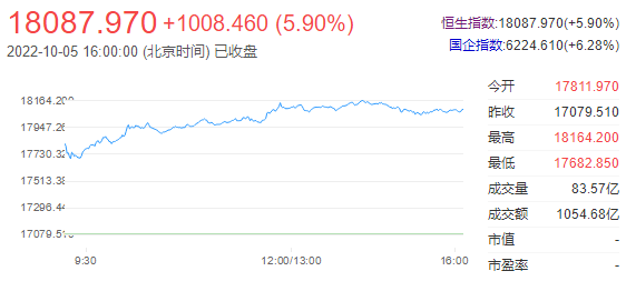 港股今日报复式反弹。恒生指数收涨5.9%,恒生科技指数收涨7.54%。科技股集体大涨,京东涨超10%,比亚迪电子涨超9%,阿里巴巴、美团、快手涨超8%。港股后市展望:中金公司表示,往前看,随着中国内地投资者本周迎来国庆长假,我们预计市场交投或将相对清淡,投资者可能等待二十大会议的召开,并从中寻求更为清晰的政策信号,因此未来几周市场可能处于持续盘整中。在目前水平市场的上涨空间大于下跌风险。在此之前,以港元计价的高股息收益率个股对投资者而言可能是较好的选择,可以提供下行保护和对冲人民币贬值的负面影响。另外,优质成长个股(例如增长维持高景气或者存在盈利反转可能的板块或标的)可能仍然是较好的选择。中期来看,判断市场出现反转或将取决于以下两个因素的兑现:1)美联储放缓加息步伐;2)有更明确证据显示中国经济增长正在摆脱低谷。