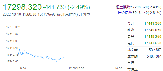 10月10日港股午间休盘,行情低开低走,香港恒生指数跌2.49%,恒生科技指数跌3.46%。