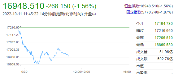 今日早盘,恒指低开低走,临近午盘恒指跌幅收窄,截至午盘,恒指跌1.56%,报16948.51点,创科实业(79 3.05 4.02%)涨超4%,领涨蓝筹,吉利汽车(10.48 0.22 2.14%)涨近2%。