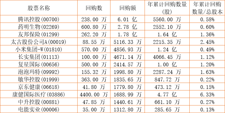 第一太平(00142)、新鸿基公司(00086)、东亚银行(00023)、希慎兴业(00014)、理文造纸(02314)、北控水务集团(00371)、互太纺织(01382)、天福(06868)、亚洲金融(00662)、亿都(国际控股)(00259)、DYNAM JAPAN(06889)、腾讯控股(00700)、中国旺旺(00151)、敏华控股(01999)、泡泡玛特(09992)、阅文集团(00772)、微盟集团(02013)、澳优(01717)、京东健康(06618)、澳能建设(01183)、惠理集团(00806)、福寿园(01448)、金利来集团(00533)、清科创业(01945)、民银资本(01141)、祖龙娱乐(09990)、兴胜创建(00896)、天伦燃气(01600)、赛晶科技(00580)、中手游(00302)、太古股份公司A(00019)、山高控股(00412)、太古股份公司B(00087)、创胜集团-B(06628)、友邦保险(01299)、中远海运国际(00517)、康健国际医疗(03886)、亚洲联合基建控股(00711)、和谐汽车(03836)、数码通电讯(00315)、名创优品(09896)、小米集团-W(01810)、电能实业(00006)、复星国际(00656)、锦胜集团(控股)(00794)、长实集团(01113)、康哲药业(00867)、汇量科技(01860)、移卡(09923)、中国飞鹤(06186)、金山软件(03888)、乐声电子(00213)、康圣环球(09960)、康基医疗(09997)、ESR(01821)、中升控股(00881)、圣诺医药-B(02257)、药明生物(02269)、联邦制药(03933)于2022年10月12日进行了回购。其中,回购金额最大的为腾讯控股(00700),回购数量238.00 万,回购金额6.01 亿元。