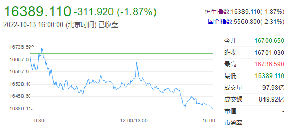 10月13日,港股收盘,指数一路下挫,截至收盘,恒生指数跌1.87%,报收16389.11点;恒生科技指数跌3.42%,报收3157.75点;均录得六连跌。港股后市展望:天风证券认为,虽然目前地缘政治局势和美联储货币政策节奏仍有待观察,但港股当前相对“极端”的估值水平(对比历史来看)或已较充分地反映了市场担忧,短期下行空间相对有限,中期估值视角下,风险收益比较可观。后续平台间收入加速的拐点或有分化(如电商平台多依赖国内消费复苏、游戏厂商受游戏版号获取影响),在扎实可行的成本费用控制策略下,本轮中国互联网行业阶段性盈利预期下调有望基本结束,业绩周期的拐点有望确立。综合而言,互联网行业估值大概处于历史底部,政策环境改善、盈利拐点有望确立下,中期风险收益比具备吸引力。