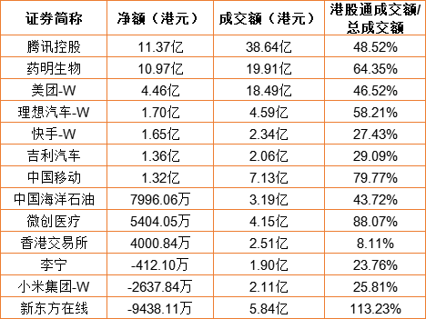 亚汇网10月14日港股通数据统计显示:腾讯控股净买入额居首,达11.37亿港元,新东方在线净卖出额居第一位。(亚汇网编辑:陌尘)
