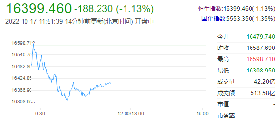 恒指早盘收跌1.13%,报16399.46点;恒生科技指数收跌2.46%,报3127.61点;医美概念股走高,微创医疗大涨10%;回港中概股走低,百度跌7.5%,哔哩哔哩跌5%;港股润歌互动上市首日涨超150%,报1.64港元每股。