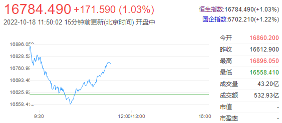 10月18日,港股半天下来,指数高位震荡,恒生指数涨1.03%,报收16784.49点;恒生科技指数涨2.49%,报收3279.94点。恒生科技指数涨2.49%,金山软件涨6.09%,阿里健康涨6.04%,哔哩哔哩涨6.10%。