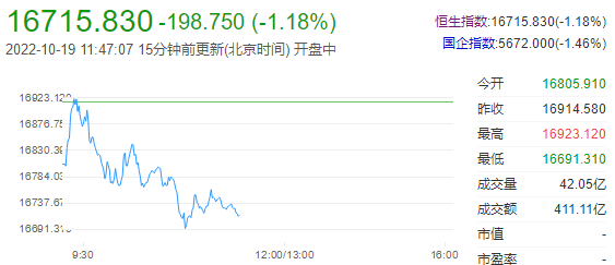 恒指早盘收跌1.18%,报16715.83点;恒生科技指数跌2.59%,报3249.83点;内房及物管股、海运板块走高;CXO概念股、回港中概股走低。