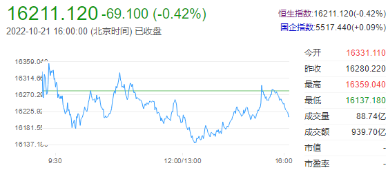 10月21日下午,港股收盘,指数全天震荡收跌,香港恒生指数跌0.42%,恒生科技指数跌0.62%。市场呈涨多跌少态势。港股后市展望:兴业证券张忆东表示,目前中国股市,无论是A股还是港股都处于中长期的底部区域,但是这个底部区域它未必能够一蹴而就呈现出一种指数性的趋势性的机会,更多还是在磨底的阶段。这种“跌深了就反抽”的反弹,但是要关注一些新的不利因素,特别是海外一些不利因素对中国经济的一些扰动。