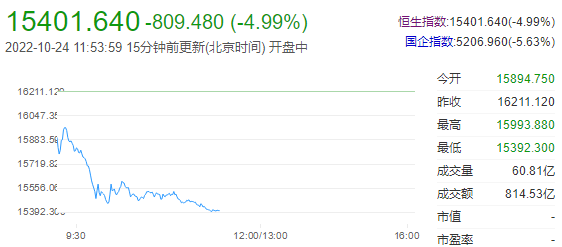 恒指午盘收跌4.99%报15402点,盘中创2009年4月底以来新低;恒生科技指数跌6.66%报2895点续刷历史新低,国指跌5.63%。南下资金半日净流入48.26亿港元,大市成交额为815亿港元。