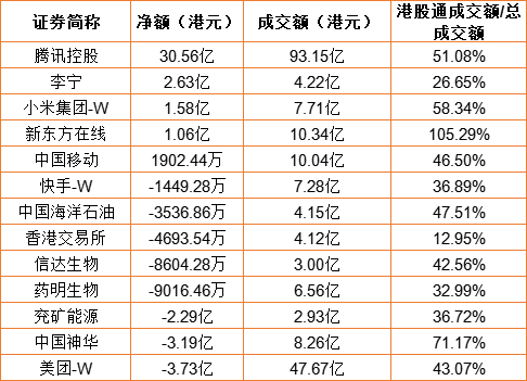 亚汇网10月24日港股通数据统计显示:腾讯控股净买入额居首,达30.56亿港元,美团-W净卖出额居第一位。(亚汇网编辑:陌尘)