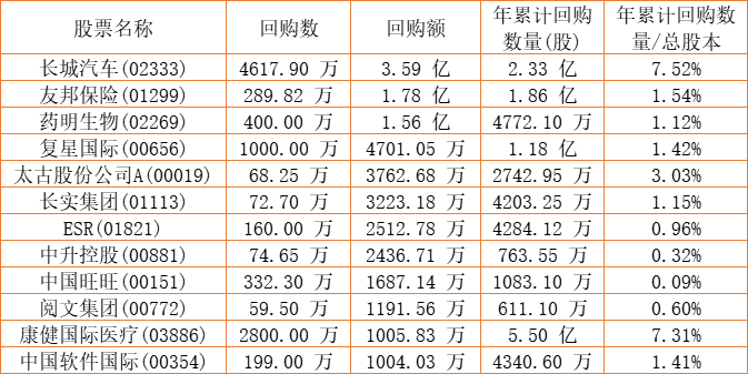 微盟集团(02013)、和谐汽车(03836)、永安国际(00289)、酷派集团(02369)、朗生医药(00503)、锦胜集团(控股)(00794)、亿都(国际控股)(00259)、亿胜生物科技(01061)、天福(06868)、阅文集团(00772)、福寿园(01448)、金利来集团(00533)、顺诚(00531)、康健国际医疗(03886)、DYNAM JAPAN(06889)、清科创业(01945)、中国旺旺(00151)、石四药集团(02005)、东亚银行(00023)、惠理集团(00806)、新鸿基公司(00086)、胜狮货柜(00716)、北控水务集团(00371)、希慎兴业(00014)、中手游(00302)、澳优(01717)、天伦燃气(01600)、长实集团(01113)、联易融科技-W(09959)、民银资本(01141)、祖龙娱乐(09990)、长城汽车(02333)、数码通电讯(00315)、金邦达宝嘉(03315)、卡森国际(00496)、赛晶科技(00580)、汇量科技(01860)、中远海运国际(00517)、金川国际(02362)、赛生药业(06600)、创胜集团-B(06628)、太古股份公司A(00019)、复星国际(00656)、移卡(09923)、太古股份公司B(00087)、港龙中国地产(06968)、中国软件国际(00354)、圣诺医药-B(02257)、友邦保险(01299)、康圣环球(09960)、中升控股(00881)、乐声电子(00213)、康基医疗(09997)、ESR(01821)、药明生物(02269)、知乎-W(02390)于2022年10月24日进行了回购。其中,回购金额最大的为长城汽车(02333),回购数量4617.90 万,回购金额3.59 亿元。
