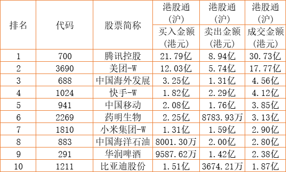 港股通(沪)买卖前十股(单位:港元):