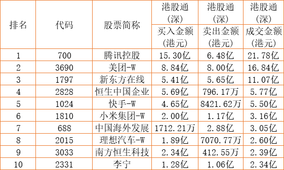 港股通(深)买卖前十股(单位:港元):