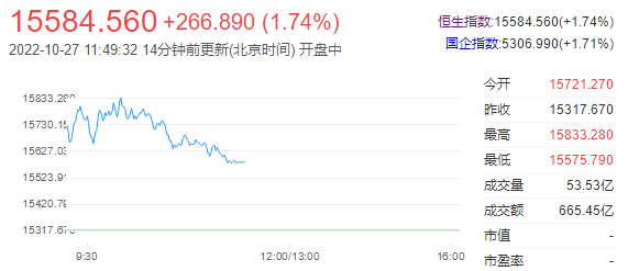恒指早盘收涨1.74%,报15584.56点;恒生科技指数收涨2.19%,报3021.30点;大型科网股走高,京东涨近9%,阿里巴巴涨近6%;烟草概念股延续昨日涨幅,思摩尔国际大涨17%,中烟香港涨近6%。