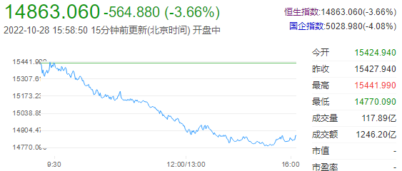 恒指收跌3.66%,报14863.06点;恒生科技指数收跌5.56%,报2822.92点;新能源汽车、回港中概股、绿色电力板块持续走低;大型科技股持续走低,小鹏汽车跌近15%,哔哩哔哩跌超10%,美团跌7%,京东跌6%,腾讯跌近6%,阿里巴巴跌4%。港股后市展望:中金公司表示,如果内外部环境有所改善,港股市场未来反弹力度有望更大。往前看,美联储在年底的政策如果可以退坡有望成为第一个压力缓解的契机。而后续更多正面催化剂的出现,如大规模稳增长政策加码以及部分风险的缓解,可能推动外资机构低配情况缓解和市场风险的重新定价。