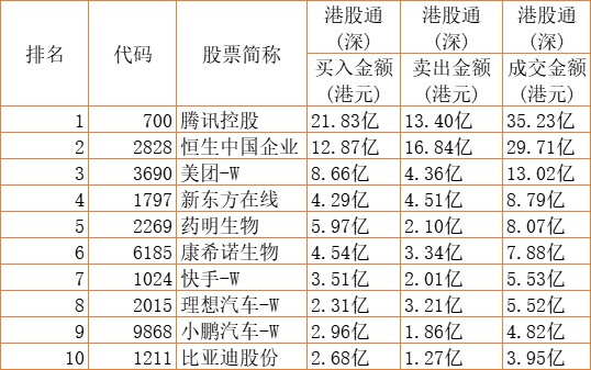 港股通(深)买卖前十股(单位:港元):