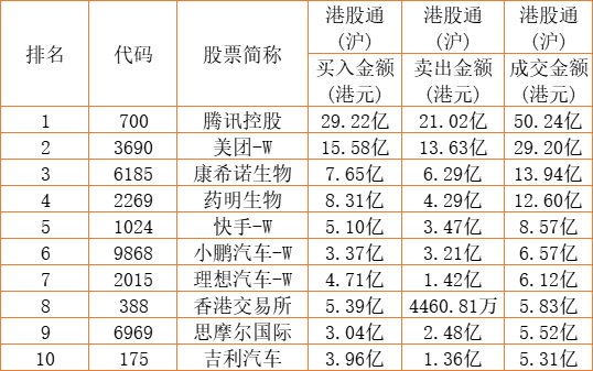 港股通(沪)买卖前十股(单位:港元):