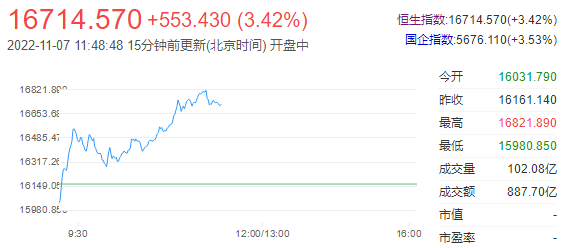 港股早上低开后再扩大跌幅,更曾失守16000关口,低见15980,最多跌180点。唯近低位有强力支持,买盘再度涌出,并重上16000,高见16821,最多升660点。恒指上星期踏入11月份,稍见转势造好,升幅颇见凌厉。周五(4日)更曾最多升超过1,173点,高见16513,创近两星期的高位。周初曾跌至近13年低位14597。随后借助好消息刺激而大幅攀升,重上15000,再冲上16000,连破两大关口。全星期累升1,298点,而高低波幅更超过1,916点。恒生科技指数周初亦创出自推出以来的纪录新低2792,随后亦跟升重上3000关口,高见3366。全周累升543点,高低波幅亦有574点。每日平均成交金额亦超过1,355亿港元。远胜早前的不足千亿。