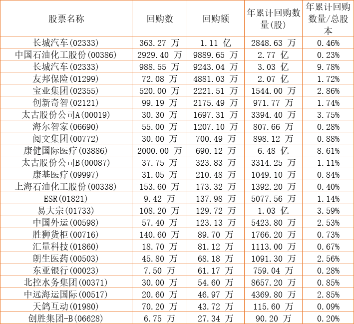 摩比发展(00947)、宝业集团(02355)、中国石油化工股份(00386)、朗生医药(00503)、中国外运(00598)、康健国际医疗(03886)、东亚银行(00023)、民银资本(01141)、亿胜生物科技(01061)、昊海生物科技(06826)、酷派集团(02369)、金利来集团(00533)、佐丹奴国际(00709)、阅文集团(00772)、天伦燃气(01600)、创新奇智(02121)、天福(06868)、清科创业(01945)、胜狮货柜(00716)、长城汽车(02333)、易大宗(01733)、创胜集团-B(06628)、汇量科技(01860)、上海石油化工股份(00338)、中远海运国际(00517)、天鸽互动(01980)、长城汽车(02333)、太古股份公司A(00019)、太古股份公司B(00087)、北控水务集团(00371)、彩客新能源(01986)、星盛商业(06668)、海尔智家(06690)、港龙中国地产(06968)、筑友智造科技(00726)、东软教育(09616)、康基医疗(09997)、友邦保险(01299)、ESR(01821)、康圣环球(09960)、知乎-W(02390)于2022年11月8日进行了回购。其中,回购金额最大的为长城汽车(02333),回购数量363.27 万,回购金额1.11 亿元。