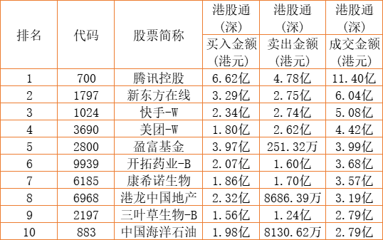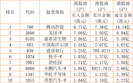 亚汇网实时数据统计:截至11月10日收盘,腾讯控股、美团-W、康希诺生物位居港股通(沪)成交前三,腾讯控股、新东方在线、快手-W位居股通(深)成交前三。