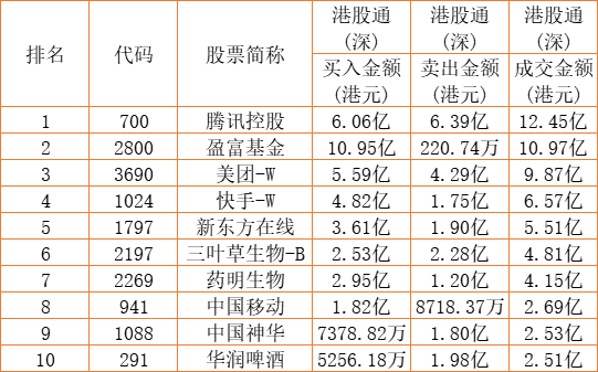 港股通(深)买卖前十股(单位:港元):