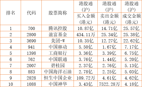 港股通(沪)买卖前十股(单位:港元):