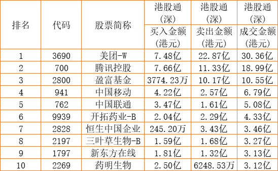 港股通(深)买卖前十股(单位:港元):